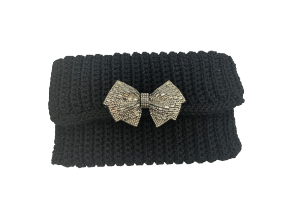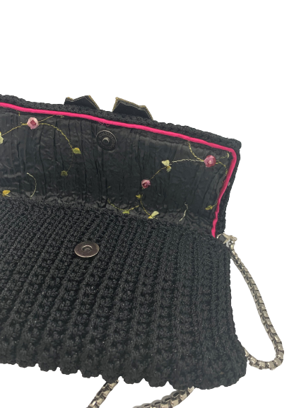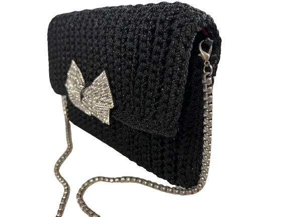 Crafted in classic black cord. Intricately woven with shimmering thread for eye-catching effect. Sparkling diamante bow at the closure to complete the refined elegance. Silver sleek chain allowing the choice of shoulder or hands free option to wear. Delicately embroidered crepe fabric lining for a luxurious finishing touch.