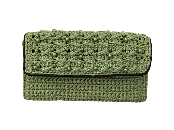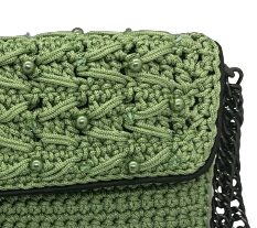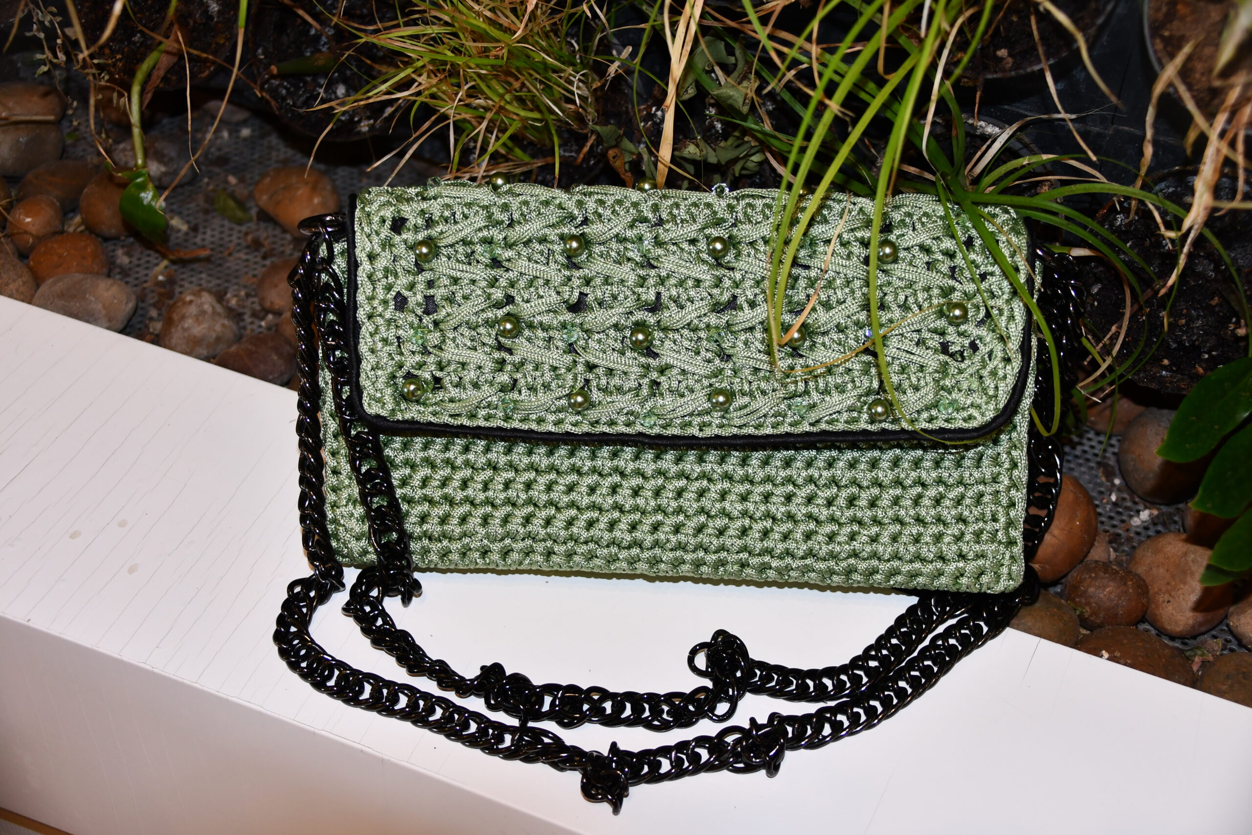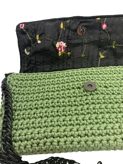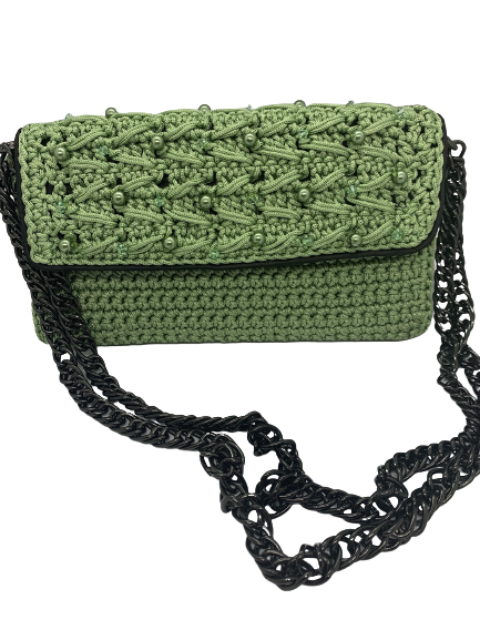 Crafted in soft green and complemented by sparkling Swarovski crystal beads. edged with contrasting black trim. A sleek black gun-metal chain strap for versatile wear or removed and used as a chic hand-held clutch. Lined with a delicately embroidered crepe fabric.